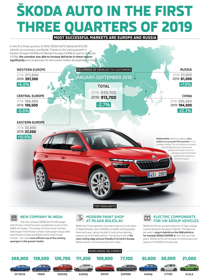 In Westeuropa steigert SKODA seine Auslieferungen in den ersten drei Quartalen um 6,8 Prozent auf 397.300 Fahrzeuge (Januar bis September 2018: 371.900 Fahrzeuge). Auch im September setzt SKODA diesen Trend fort und kann stark zulegen: 42.200 ausgelieferte Fahrzeuge bedeuten ein Plus von 29,7 Prozent im Vergleich zum Vorjahr (September 2018: 32.600 Fahrzeuge). In seinem weltweit zweitstärksten Einzelmarkt Deutschland kommt SKODA in den ersten neun Monaten des Jahres auf 146.300 Auslieferungen (Januar bis September 2018: 133.200 Fahrzeuge; +9,9 %). Im September steigen die Auslieferungen im Vergleich zum Vorjahr um 33,5 Prozent auf 14.800 Fahrzeuge (September 2018: 11.100 Fahrzeuge). In den ersten drei Jahresquartalen legt SKODA in Frankreich (26.400 Fahrzeuge; +12,1 %), Österreich (22.100 Fahrzeuge; +12,0 %), in der Schweiz (16.500 Fahrzeuge; +31,2 %), in den Niederlanden (14.400 Fahrzeuge; +12,5 %) sowie in Dänemark (12.100 Fahrzeuge; +19,5 %) zweistellig zu.