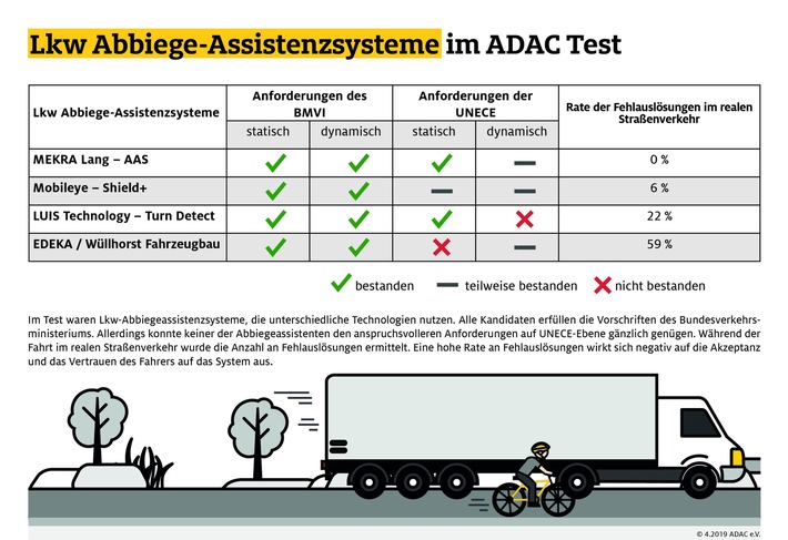 Im ADAC-Test wurden Abbiegeassistenzsysteme mit unterschiedlichen Technologien untersucht: EDEKA/Wüllhorst Fahrzeugbau, Mobileye – Shield+, MEKRA Lang – AAS sowie LUIS Technology. Die Kosten für die Systeme schwanken zwischen 760 und 2650 Euro bei einem Arbeitsaufwand für den Einbau von bis zu sechs Stunden. Fazit: Jeder der Assistenten konnte im Test zwar die Vorschriften des Bundesverkehrsministeriums (BMVI) erfüllen, den deutlich anspruchsvolleren Anforderungen auf internationaler Ebene, die voraussichtlich ab 2022 gelten, konnte kein Testkandidat entsprechen. Am besten schnitt im Test das System AAS von MEKRA Lang ab.