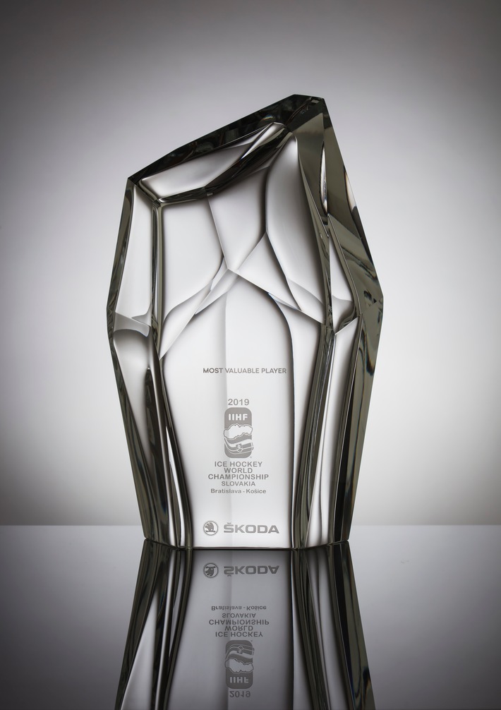 SKODA Design hat anlässlich der IIHF Eishockey-Weltmeisterschaft 2019 erneut die Kristallglastrophäe für den ,Most Valuable Player‘ des Turniers gestaltet. Die Form der Trophäe aus tschechischem Kristallglas erinnert an einen Eiskristall. Außerdem zitiert die Trophäe kristalline Elemente, die auch die Fahrzeuge des tschechischen Automobilherstellers prägen. Im Anschluss an das WM-Finale in der slowakischen Haupstadt Bratislava wird SKODA AUTO Vorstandsvorsitzender Bernhard Maier die Trophäe an den wertvollsten Spieler des Turniers überreichen.