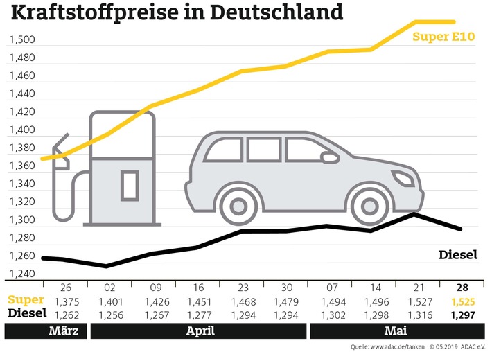 Autofahrer können an den Tankstellen wieder etwas durchatmen. Laut aktueller Auswertung des ADAC müssen sie für einen Liter Super E10 im Bundesdurchschnitt 1,525 Euro bezahlen, das sind 0,2 Cent weniger als in der Vorwoche. Diesel verbilligte sich noch deutlicher um 1,9 Cent auf 1,297 Euro je Liter. Für Benzin ist dies im Wochenvergleich der erste Rückgang nach zuletzt elf Anstiegen in Folge. Weiter geöffnet hat sich die Preisschere zwischen Benzin und Diesel. Die mittlere Preisdifferenz zwischen beiden Kraftstoffsorten, die im Februar zeitweise nur 7 Cent pro Liter betrug, hat sich auf 22,8 Cent vergrößert.