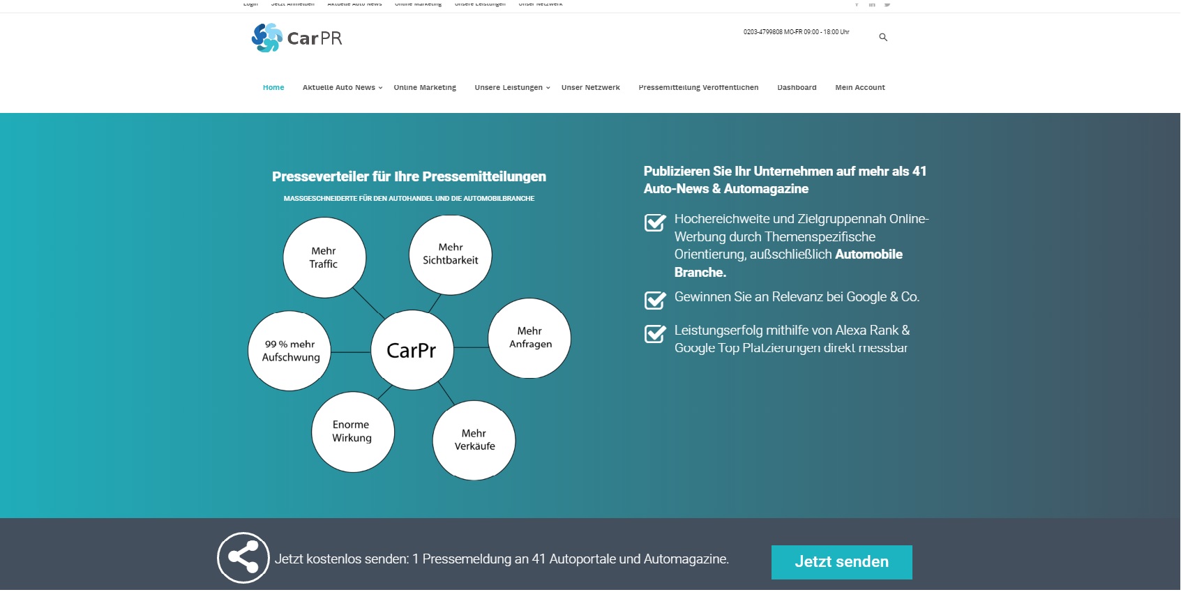 Sie arbeiten rund um das Thema “Auto”? Veräußern Gebrauchtwagen oder Autozubehör, betreiben eine Verwertung von Autoteilen oder eine Kfz-Werkstatt? Sie sind Anbieter von Kfz-Versicherungen? Dann sollten Sie CarPR kennenlernen. CarPR ist auf Marketingstrategien im Automarkt in seinem weitesten Sinne spezialisiert und verfügt mit seinem umfangreichen Netzwerk über genau die richtigen Adressaten, um Ihre Domain und ihre Unterseiten weit nach vorne zu bringen.