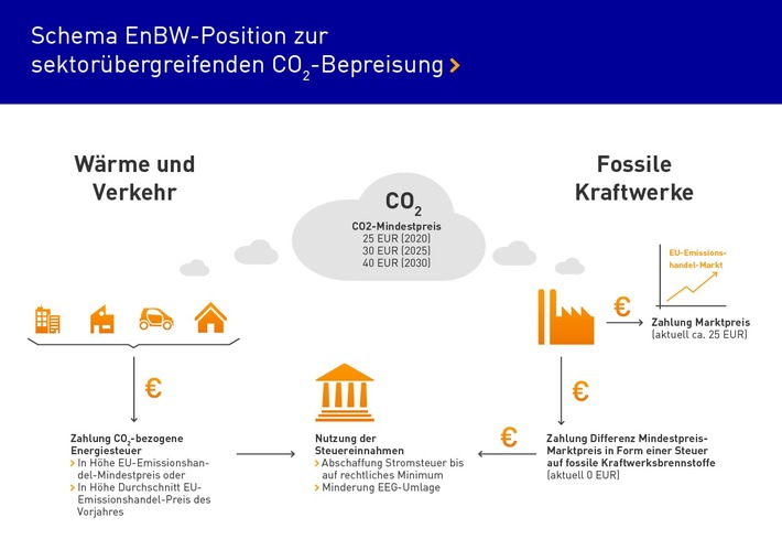 Konkret fordert die EnBW: - Die Einführung eines CO2-Aufschlags auf die Energiesteuern im Verkehrs- und Wärmesektor. Nach Energiewirtschaft und Industrie würden CO2-Emissionen damit auch sektorübergreifend einen Preis erhalten. - Die Festsetzung eines nationalen CO2-Mindestpreises im europäischen Emissionshandel mit einem moderaten Steigerungspfad. Das bedeutet Planungssicherheit für alle Betroffenen, insbesondere für den Ausbau der Erneuerbaren Energien. Konkret sollte dieser auch sektorübergreifend geltende Mindestpreis je Tonne CO2 bei 25 Euro (2020) liegen, 2025 auf 30 Euro und 2030 auf mindestens 40 Euro steigen. - Eine grundlegende Reform der Abgabenstruktur für Strom: Die im Verkehrs- und Wärmesektor erzielten Mehreinnahmen des Staates werden über eine Senkung der Stromkosten vollständig an die Verbraucher rückverteilt, u.a. über eine fast vollständige Abschaffung der Stromsteuer.