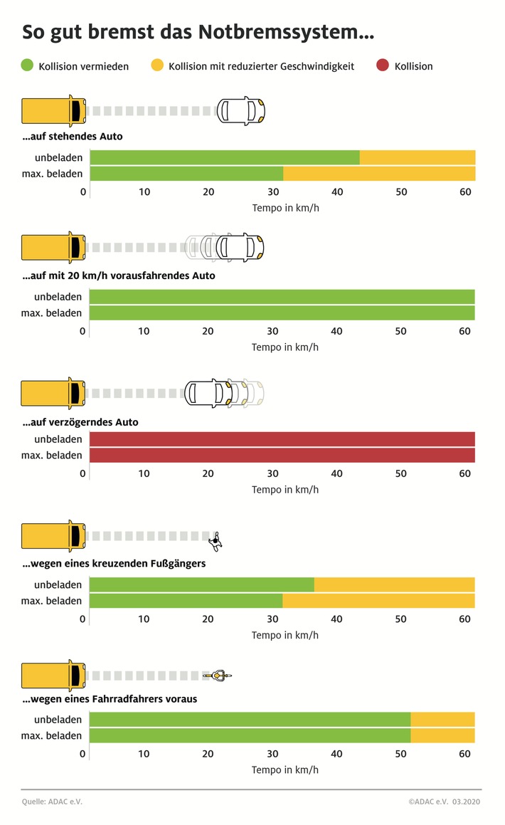 Der ADAC fordert die Hersteller auf, die Notbremsassistenten auch vor der gesetzlichen Verpflichtung für Transporter zu verbessern und als Serienausstattung anzubieten. Zudem sollte der Beladungszustand keinen Einfluss auf die Leistung von Assistenzsystemen haben.