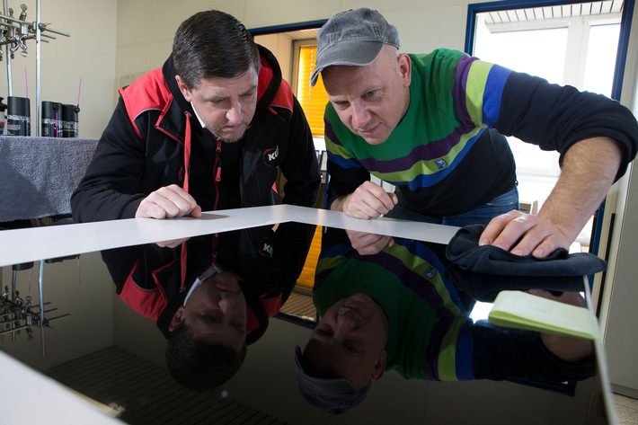 Wasser soll fein vom Lack abperlen – auch nach mehreren Monaten und diversen Wäschen. Im Mittelpunkt bei einem Test von Schutzwachsen steht die Ermittlung der Langzeitwirkung. Dies geschieht bei der Prüfung der Hydrophobie – der Eigenschaft, Wasser zu verdrängen. Auch hierfür gibt es ein spezielles Prüfgerät: den Randwinkel-Messer. Gemessen wird der Kontaktwinkel, den ein vom Gerät abgegebener Wassertropfen auf der Lackoberfläche einnimmt. Je höher der Winkelwert, desto hydrophober, also wasserabweisender, ist die Wirkung des Wachses. Jedes Testblech wird nach dem Produktauftrag von Hand mit einem genormten Prüfshampoo gewaschen. Nach jedem der zehn Waschvorgänge wird der Kontaktwinkel gemessen. Die Verträglichkeit mit Kunststoffen wird an Polycarbonat-Teststreifen geprüft.