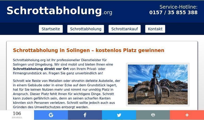 Beim Anbieter Schrottabholung.org erhalten Kunden sechs Tage die Woche den Service der Schrottabholung. Nach einer Terminabsprache wird der Schrott abgeholt. Die Mitarbeiter übernehmen das Verladen und wenn erforderlich ebenso die Demontage. Diesen Service können sowohl Privatkunden als auch Firmenkunden nutzen.