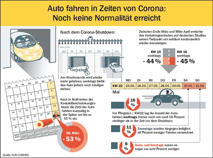 Auf den Straßen herrscht wieder reger Verkehr. Doch sind wir in Sachen Mobilität bereits in der Normalität angekommen? Nein – das zeigt eine aktuelle Auswertung der HUK-COBURG. Deutschlands größter Kfz-Versicherer hat auf Basis von Telematikdaten untersucht, wie sich die Corona-Krise auf das Fahrverhalten ausgewirkt hat.