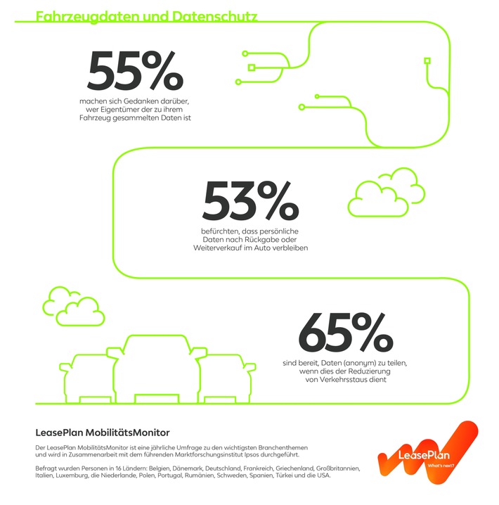 – Download des Schwerpunktthemas „Fahrzeugdaten und Datenschutz“ aus dem MobilitätsMonitor von LeasePlan mit allen Ergebnissen: https://www.leaseplan.c om/de-de/neuigkeiten-termine/leaseplan-mobilitaetsmonitor-zeigt-das-thema-date nschutz-steht-ganz-oben/ – Der LeasePlan MobilitätsMonitor ist eine jährliche Umfrage zu den wichtigsten Branchenthemen und wird in Zusammenarbeit mit dem führenden Marktforschungsinstitut Ipsos durchgeführt. – Befragt wurden Personen in 16 Ländern: Belgien, Dänemark, Deutschland, Frankreich, Griechenland, Großbritannien, Italien, Luxemburg, die Niederlande, Polen, Portugal, Rumänien, Schweden, Spanien, Türkei und die USA. – LeasePlan plädierte zum ersten Mal für einen neutralen Server in einem Op-ed (Opposite Editorial) für „Het Financieele Dagblad“, das hier (https://www.leas eplan.com/corporate/blog/digital-mobility/give-drivers-more-control) auf Englisch zu lesen ist. – Im Oktober 2019 veröffentlichte LeasePlan das erste MobilitätsMonitor-Thema „Elektrofahrzeuge und Nachhaltigkeit“. (https://www.leaseplan.com/de-de/neuigk eiten-termine/leaseplan-mobilitaetsmonitor-2019/)