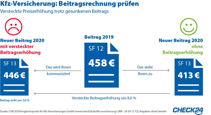 Im Beispiel kostet die Kfz-Versicherung aktuell 458 Euro im Jahr. Der Versicherer verlangt im kommenden Jahr 446 Euro, also rund drei Prozent weniger. Doch der Blick auf den Vergleichsbeitrag zeigt: Die Kosten hätten auf 413 Euro sinken müssen.1) Der neue Kfz-Versicherungsbeitrag fällt acht Prozent zu hoch aus: eine versteckte Beitragserhöhung des Versicherers.