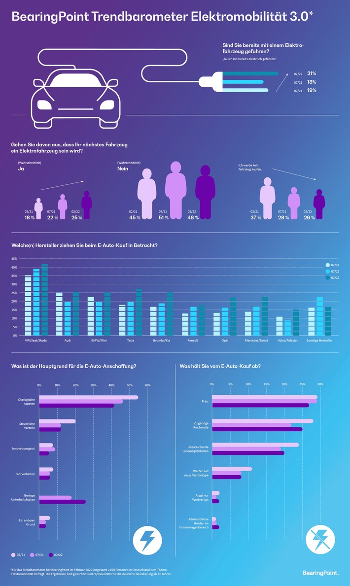 Immer mehr Menschen sind elektrisch unterwegs und setzen beim nächsten Neukauf auf ein E-Auto. Laut dem aktuellen BearingPoint-Trendbarometer Elektromobilität wächst mit dem steigenden Anteil der E-Auto-Nutzer auch die Begeisterung für die neue Antriebstechnik. Inzwischen will schon jeder Vierte in Deutschland bei der Neuanschaffung ein Fahrzeug mit elektrischem Antrieb kaufen. Auch wenn ökologische Aspekte weiter der Hauptgrund für den Erwerb eines E-Autos sind, werden schon an zweiter Stelle die geringen Unterhalts- und Servicekosten als Kaufgrund genannt.