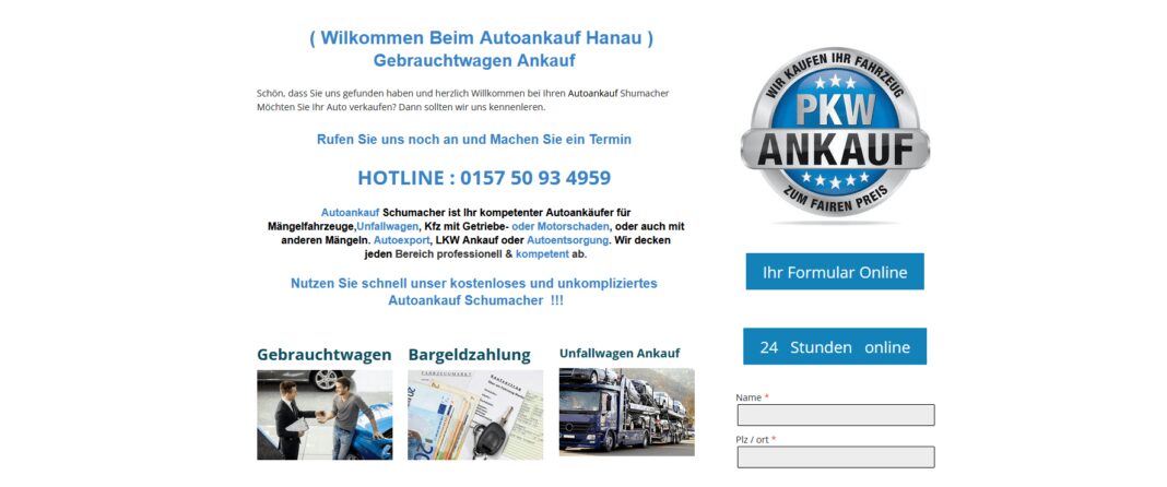 Besser, als das unverkäufliche Altfahrzeug in dem Main zu kutschieren, erscheint da ein Anruf bei Autoankauf Hanau, damit das Mängelfahrzeug kostenfrei abgeholt wird. Autoankauf Hanau zahlt sogar noch einen anständigen Preis für das alte KFZ, das eigentlich auf dem privaten Automarkt gänzlich unverkäuflich ist.