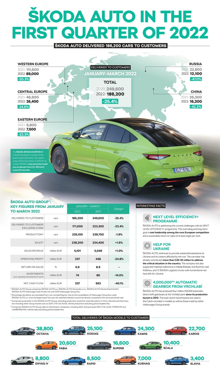 Vor dem Hintergrund des russischen Angriffs auf die Ukraine hat der Konzernvorstand von Volkswagen Anfang März entschieden, die Produktion von Fahrzeugen in Russland bis auf weiteres einzustellen und den Fahrzeugexport nach Russland zu stoppen. In den ersten zwei Monaten des Jahres verzeichnete ŠKODA dort 12.100 Auslieferungen (Januar bis März 2021: 22.800 Fahrzeuge; -47,0 %).