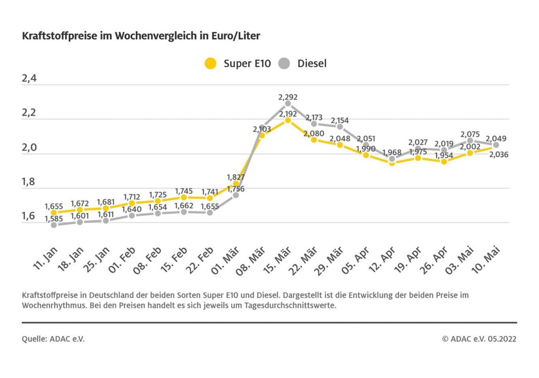 Laut ADAC sind die Spritpreise weiter stark überteuert. So waren die Rahmenbedingungen für die Bildung der Kraftstoffpreise wie der Rohölpreis und der Dollarkurs Anfang März insgesamt vergleichbar mit den aktuellen. Damals lag der Preis für Super E10 jedoch bei 1,83 Euro und damit um 20 Cent niedriger als zurzeit. Diesel kostete Anfang März 1,76 Euro und damit 29 Cent weniger als aktuell.