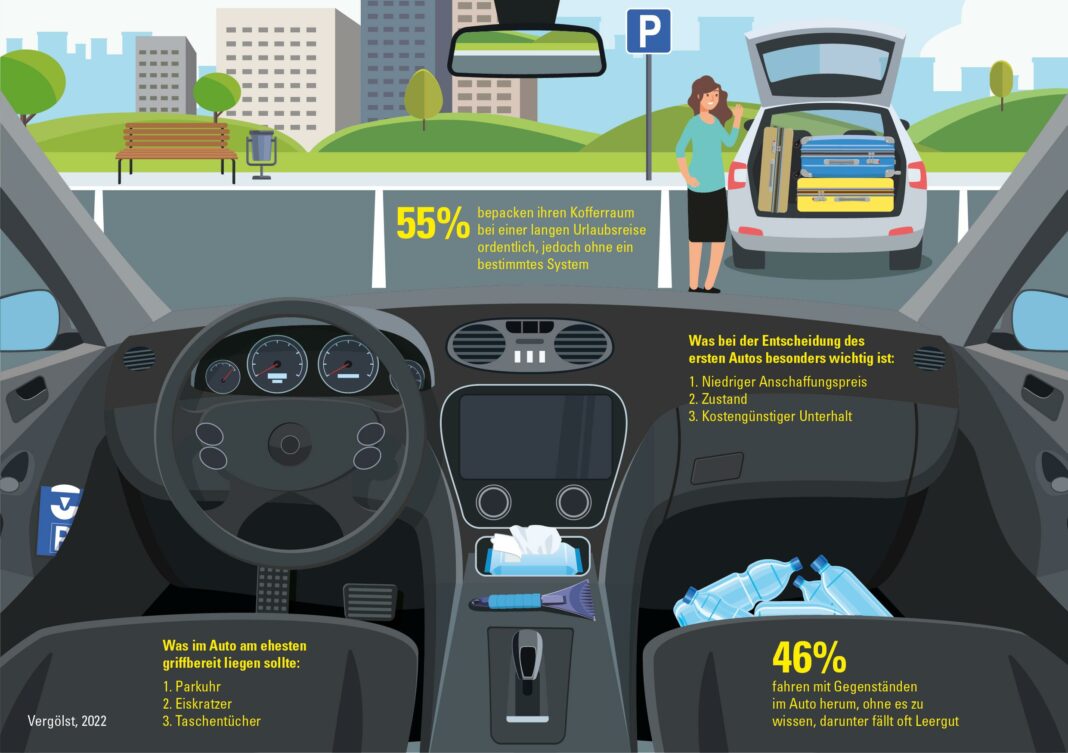 Welche Kriterien sollte das erste Auto erfüllen? Was sollte auf jeder Fahrt griffbereit liegen? Wie räumen deutsche Autofahrer*innen ihren Kofferraum am liebsten ein? Welche Dinge haben sie schonmal unnötig durch die Gegend gefahren? Diesen Fragen ist das Marktforschungsinstitut Statista im Auftrag von Vergölst auf den Grund gegangen.