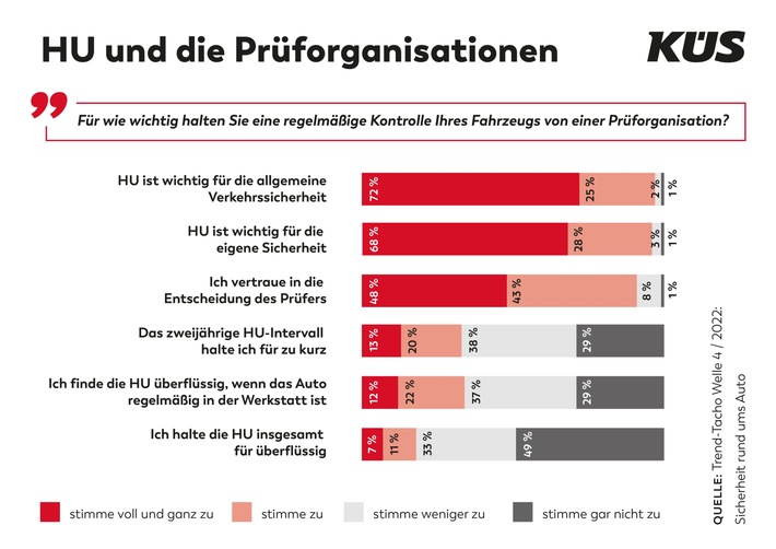 „Der aktuelle KÜS-Trend-Tacho belegt das hohe Vertrauen, das deutsche Autofahrer*innen in die Hauptuntersuchung haben. Eine deutliche Mehrheit von ihnen sieht die HU als wichtig an für die Sicherheit aller, die am Straßenverkehr teilnehmen“, erklärt KÜS-Hauptgeschäftsführer Peter Schuler, „für diese Sicherheit ist aber auch entscheidend, dass die Fahrzeuge innerhalb der vorgeschriebenen Intervalle zur HU kommen. Außerdem erspart eine fristgerechte HU vermeidbare Extrakosten.“