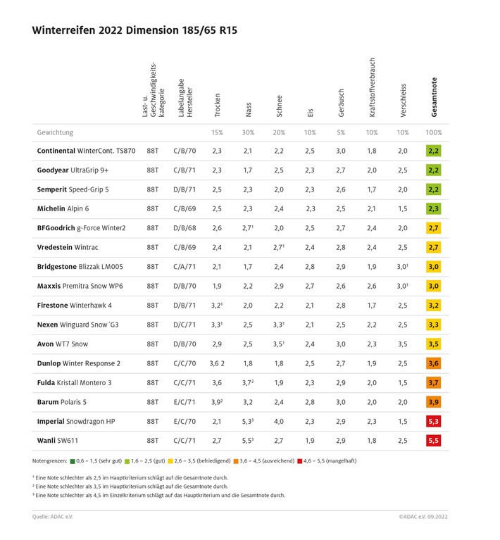 In der Dimension 185/65 R15 (T) für VW Polo, Audi A1 oder Opel Corsa sind die Reifen von Continental, Goodyear, Semperit und Michelin sehr ausgewogen, zeigen insbesondere auf Nässe, Schnee und trockener Fahrbahn gute Leistungen und bekommen daher das ADAC Urteil „gut“. Danach folgt ein breites Mittelfeld, das mit wachsenden Einschränkungen parallel zu den absteigenden Platzierungen empfohlen werden kann. Hier spart ein genauer Blick in die Ergebnistabelle bares Geld, denn in dieser Dimension sind die guten Reifen nicht sehr viel teurer als die Modelle mit Einschränkungen.