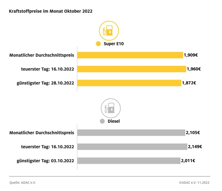 Der teuerste Tag zum Tanken war im vergangenen Monat der 16. Oktober: Ein Liter Super E10 kostete an diesem Tag 1,960 Euro, ein Liter Diesel 2,149 Euro. Der günstigste Tag des Monats war für die Fahrer von Benziner-Pkw der 28. Oktober bei einem Durchschnittspreis von 1,872 Euro. Diesel-Fahrer konnten am 3. Oktober bei 2,011 Euro am preiswertesten tanken.