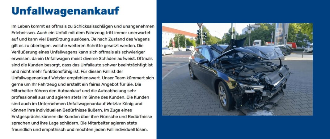 Ein Unfall ist stets ein ärgerliches Ereignis. Das Fahrzeug verliert immer massiv an Wert und die Zahl der Interessenten verringert sich dramatisch. Hier empfiehlt sich der Kontakt zum Autoankauf Wetzlar. Der Gebrauchtwagen Ankauf ist in der Lage, auch Unfallwagen verlässlich zu bewerten und einen fairen Ankaufpreis aufzurufen.