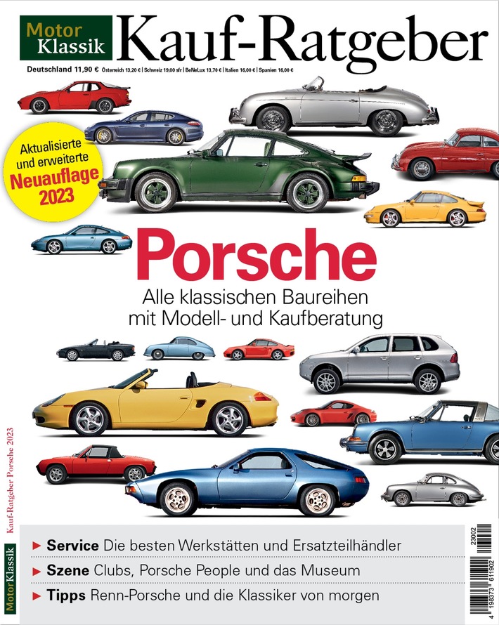 Passend zum 75. Geburtstag von Porsche und zu 60 Jahren 911 hat die Redaktion Motor Klassik den erfolgreichen – aber längst vergriffenen – Kauf-Ratgeber Porsche aktualisiert, erweitert und neu aufgelegt. Auf 164 Seiten wird für alle Modelle der klassischen Baureihen die volle Bandbreite relevanter Informationen über Historie, Technik, Motoren und Fahrwerke abgebildet. Tipps von Experten sowie eine umfangreiche Information zu Ersatzteilen und Werkstätten inklusive Adressen von Spezialisten und Clubs ergänzen das Sonderheft. Der Kauf-Ratgeber Porsche ist ab sofort im Handel und über shop.motorpresse.de erhältlich (auch als E-Paper).