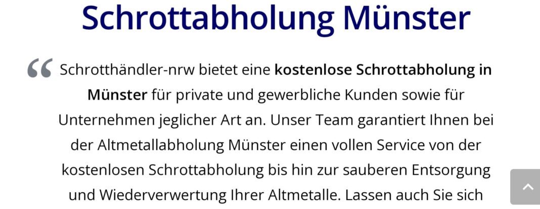 Originalinhalt von Schrotthändler NRW, veröffentlicht unter dem Titel “ Schrottabholung Münster: Platz schaffen und Rohstoffe zurückgewinnen. „, übermittelt durch CarPr.de